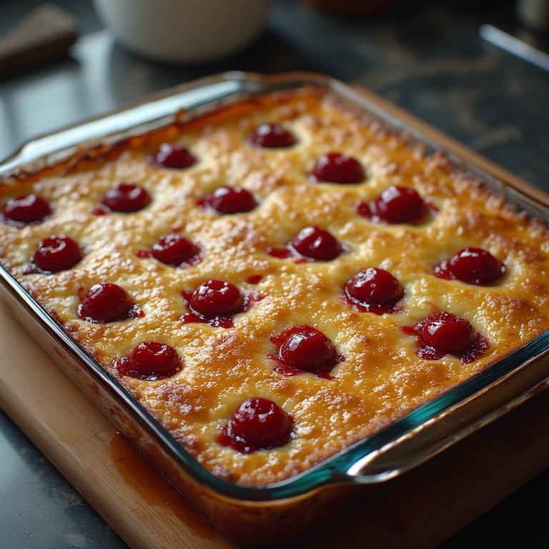 The Custard: A simple homemade custard (eggs, milk, sugar) is poured over the cherries, creating a creamy, pudding-like layer as it bakes.