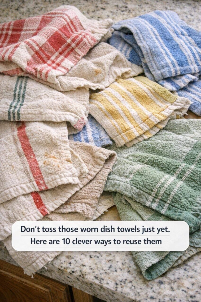 Don’t throw away your tired, stained, or fraying dish towels! With a little creativity, you can give them a second life in handy ways around the home.