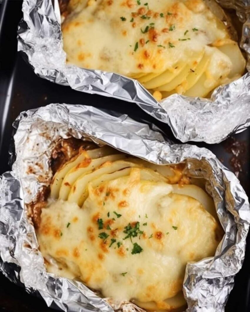 The challenge: potatoes cook slower than meat, and getting the sauce to stay creamy inside foil (not burn or dry out) requires a few adjustments from the oven method.