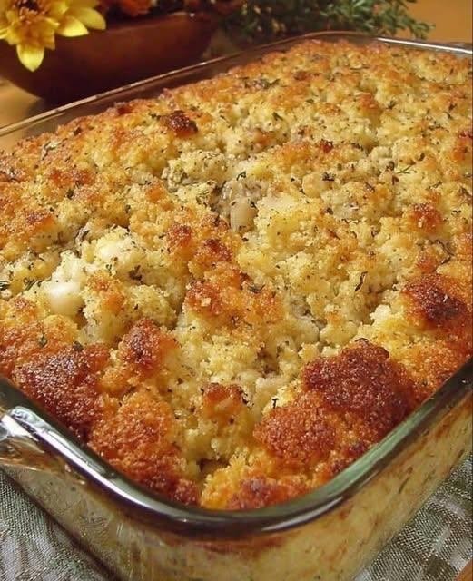 Texture Contrast: Southern dressing should have a crispy, almost crackly top with a moist, savory, pudding-like interior.